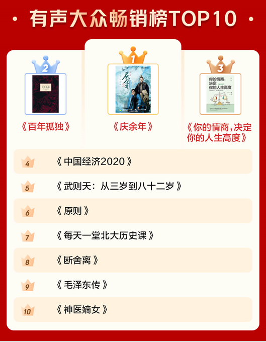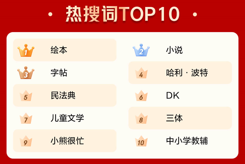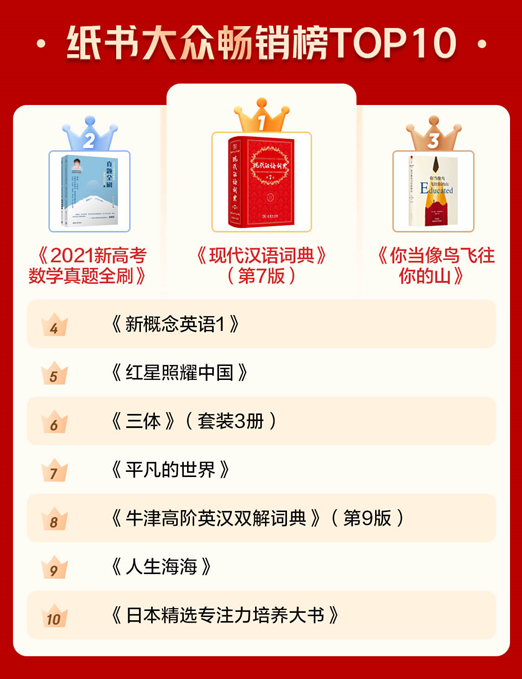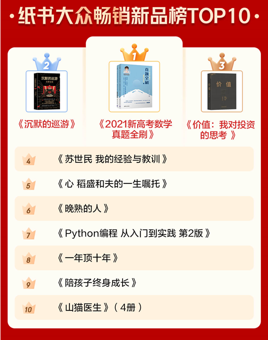 自我提升、孩子教育成为纸书消费热点 2020最受大众欢迎的新书是哪些?通过京东数据可以看出,自我提升类和孩子教辅、教育类新书名次领先。 面对未知需要有更多的应变能力,纸书大众新品TOP10中就有《价值:我对投资的思考》《苏世民:我的经验与教训》《心 稻盛和夫的一生嘱托》《一年顶十年》这4本投资管理及自我提升书籍。其中,江湖人称“猫叔”的作者“剽悍一只猫”在2020年5月出版的《一年顶十年》是一套完整的个人影响力打造和财富升级的干货指南,深受想要快速提升自身实力的读者青睐,京东自营图书页面上读者评论近4万条。 疫情期间家长陪伴孩子的时间变长,不少父母利用这段时间加强亲子沟通,樊登2020年推出的新书《陪孩子终身成长》成为不少家长的选择,这本书是作者继《读懂孩子的心》之后,推出的又一部陪伴孩子成长的书籍,在京东自营图书页面商品好评度达到99%。 高考是中国大多数学生的必经之路,想要从万人中脱颖而出,需要付出许多的努力。从京东图书数据不难看出,攻克数学难关已成为万千学子的重要任务,在2020年最畅销的大众新书和最畅销的大众纸书中,《2021新高考数学真题全刷》分别排名第一、第二。 数字阅读凸显成年人阅读兴趣点 数字阅读跟纸书最大的不同是,常见的教辅书和童书等很少出现在数字阅读畅销榜中,无论是电子书还是有声书,更多的体现出成年人的阅读兴趣。 2020年疫情给全世界的政治经济格局都带来深远影响,通过电子书畅销榜TOP10和有声畅销榜TOP10可以看出,很多人愈发关注投资和管理等方面的内容,也愈发注重个人学习。《价值:我对投资的思考》《苏世民:我的经验与教训》 分别位居电子书畅销榜第一名和第二名。《中国经济2020》《原则》进入有声畅销榜前十。此外,学习类图书《Python编程:从入门到实践》《漫画算法:小灰的算法之旅(Python篇)》也上榜电子书畅销榜前十。 随着大IP改编影视剧的热度逐年升高,影视剧原著小说也越来越成为数字阅读中最畅销的书籍类型。其中,《庆余年》随着电视剧的火爆和《庆余年2》原班人马即将开拍带来的热议流量,其原著小说入围电子书畅销榜TOP10和有声书畅销榜TOP10;改编为《沉默的真相》的紫金陈原著小说《长夜难明》则位列电子书畅销榜第6名。 随着经济的发展,用户需求更加多元,对文娱相关衍生品,例如文艺类台历和影视周边商品的需求也在逐年增加。明星周边的衍生品成为最受用户欢迎的文娱产品,蔡徐坤Q版公仔和蔡徐坤官方应援灯连续两年销量领先。音乐类的文娱商品也深受用户喜爱,新晋歌手陈立农和经典歌手李健、林俊杰的音乐专辑都有较高热度;豆瓣电影日历和哆啦A梦台历也获得用户的追捧。 “热搜词”显示孩子教育依然是关注重点 用户在电商网站用关键词进行搜索的这种主动行为,更能体现市场动向及用户的关注点。那么,这一年,用户在京东图书都在搜索什么呢? 从京东图书2020年热搜词TOP10来看,“绘本”“字帖”“哈利·波特”和“三体”连续两年上榜,搜索热度不减。“小说”荣登热搜词TOP10的第二名,2020年5月颁布的民法典在产生重大社会影响的同时,也带动了用户对它的搜索热度。此外,与儿童相关的热搜词,如:“DK”“儿童文学”“小熊很忙”和“中小学教辅”占据TOP10榜单中的4席,孩子教育依然是用户关注的重点。 这些搜索热词同样带动了相关图书的销售。儿童书作家北猫和崔钟雷成为京东图书2020年最受欢迎作者的第一名和第二名。在“哈利·波特”和“三体”成为热搜词的同时,作家J.K.罗琳和刘慈欣也入围京东图书2020年最受欢迎作者TOP10。 2020年最受欢迎作者还包括5位教辅、工具书类书籍作者,如朱昊鲲、薛金星、李永新、杨文彬,相比2019年考研书籍作者排名第1,2020年K12阶段及考公教辅书籍热度飙升。 产品过硬,品牌出版机构持续霸榜 畅销图书的背后,是始终坚持为读者带去好书的各大出版机构。通过京东图书销售数据可以看出,在2020年,无论是纸书出版机构TOP10,还是电子书出版机构TOP10,其中9家都与2019年保持一致。其中,中信出版集团和机械工业出版社连续三年分别位居京东纸书出版社机构Top10的冠军和亚军。中信出版集团,还连续两年蝉联电子书出版机构Top10的第一名。在电子书出版机构中,上海读客文化增速明显。 在众多京东图书店铺中,文轩网旗舰店、博库网旗舰店、中信出版社官方旗舰店和凤凰新华书店旗舰店销量连续两年位列前四。 学习工作两不误 北上广深和成都用户最爱买书 2020年哪些城市最爱买书?纵观各地图书成交额来看,北上广深是一线城市,也是买书先锋城市。京东数据显示,北京、上海、广州、深圳和成都五个城市在图书用户数量、成交数量和成交额上在2020年依旧保持名列前茅的佳绩,北上广居民在阅读上始终保持最高的追求,成都则大有奋起直追的趋势,不仅用户数量上超越深圳位列第4,还在成交额和成交数量上牢牢占据第5的席位;历史名城西安则展现出了自己作为千年古都的文化氛围,在悠久历史文化的熏陶下西安人民的买书热情也相当火爆,在用户数量、成交数量两个榜单上分别位列第6、第7。 如果按省(自治区、直辖市)来看,图书成交额前十跟2019年相比变化不大,仅湖北从2019年的第7降为2020年的第10;从成交额同比增速看,西北地区的甘肃、陕西、青海和新疆增