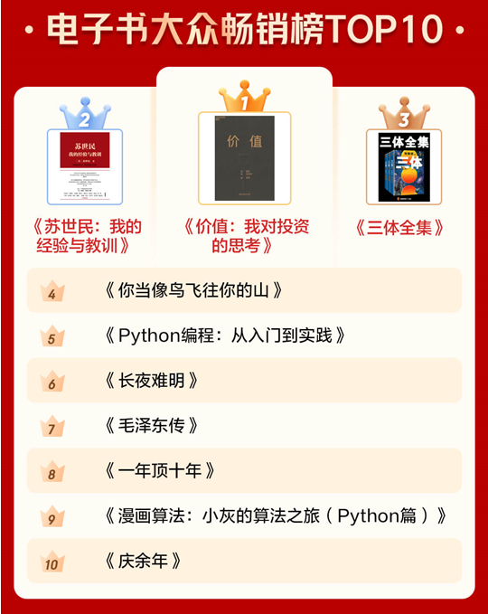 根据京东图书大数据,不同媒介的阅读用户,在书籍选择上也有所差别。比如在传统的纸书方面,经典长销的图书生命力依旧持久,包括学生必备的学习工具《现代汉语词典》、刘慈欣的代表作《三体》、路遥的代表作《平凡的世界》在内的三种图书连续三年成为畅销纸书TOP10。电子书方面,金融理财类和小说类电子书更深受用户喜爱,《价值:我对投资的思考》《苏世民:我的经验与教训》《三体》位列前三。习惯利用碎片化时间听书的用户,更喜欢文学作品和人生哲学,《庆余年》《百年孤独》《你的情商,决定你的人生高度》成为最畅销的有声书。
