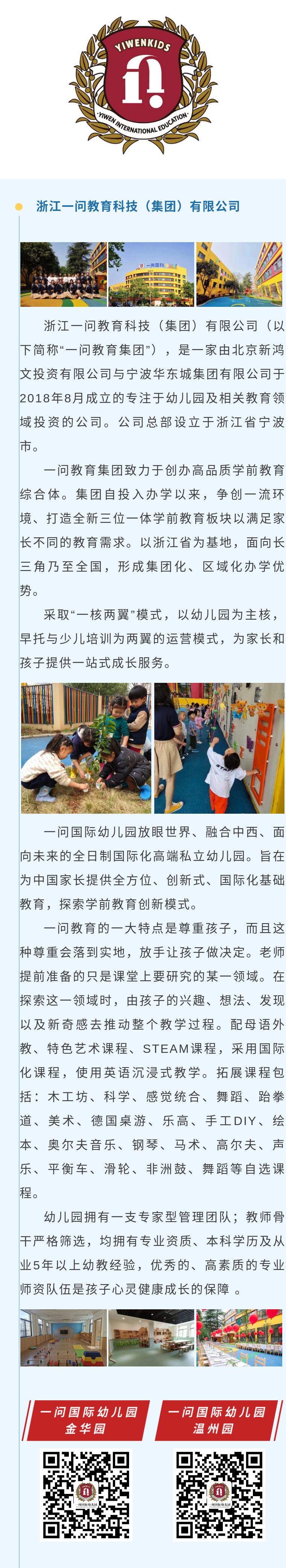 随后乐八一副会长还向张安琪副秘书长介绍了他投资的一问国际幼儿园项目。一问国际幼儿园得名于人民教育家陶行知先生的《每事问》,“发明千千万,起点是一问。”创造源于提问,创新起点一问。幼儿园采取“一核两翼”模式,以幼儿园为主核,早托与少儿培训为两翼的运营模式,为家长和孩子提供一站式成长服务。引入中西方的先进教育理念,让孩子在探索中学习,在情境中体验,在实践中成长,研发形成了一问特色的生成式主题方案课程。被教育部规建中心授予“未来教育实验学校”称号。