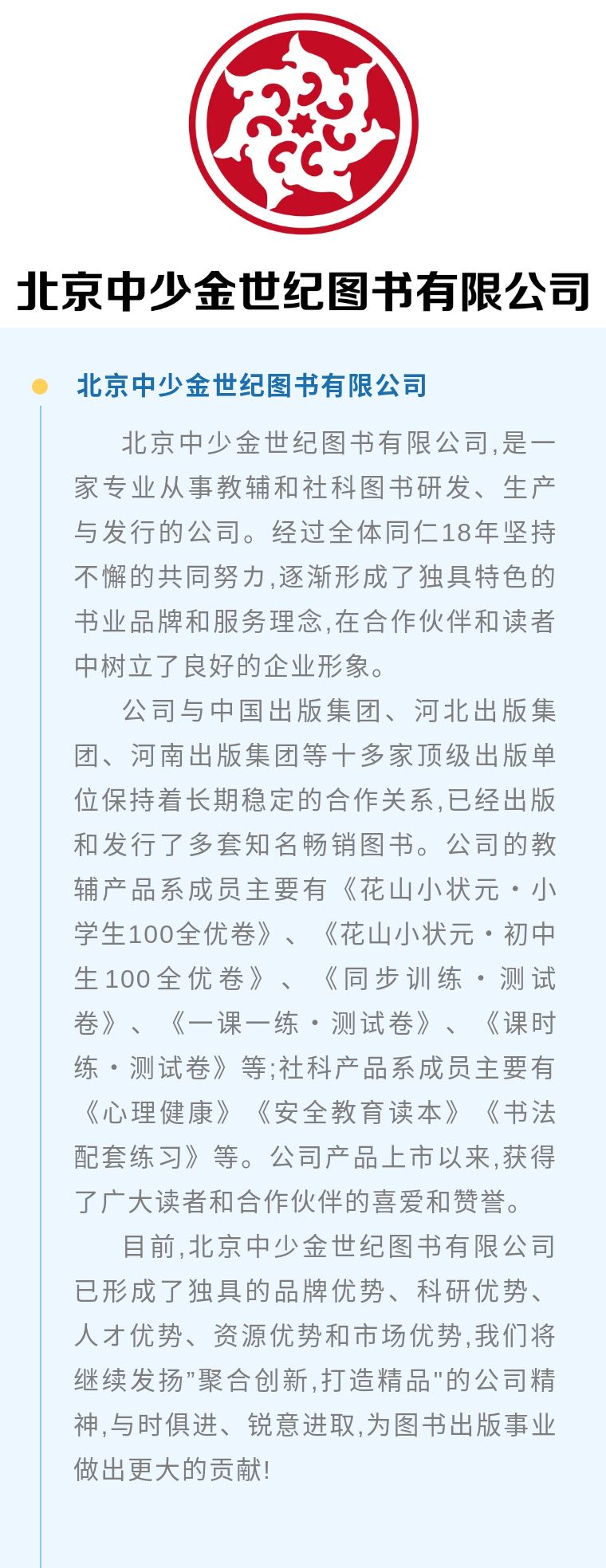 北京中少金世纪图书有限公司董事长乐八一热情接待了张安琪副秘书长一行,并详细介绍了公司的产品结构和运作模式。目前, 北京中少金世纪图书有限公司的业务范围已经覆盖浙江、河北两省的数百个县市,公司旗下自主研发的品牌教材教辅及自有社交平台在浙江、河北两省的覆盖率均处领先水平。
