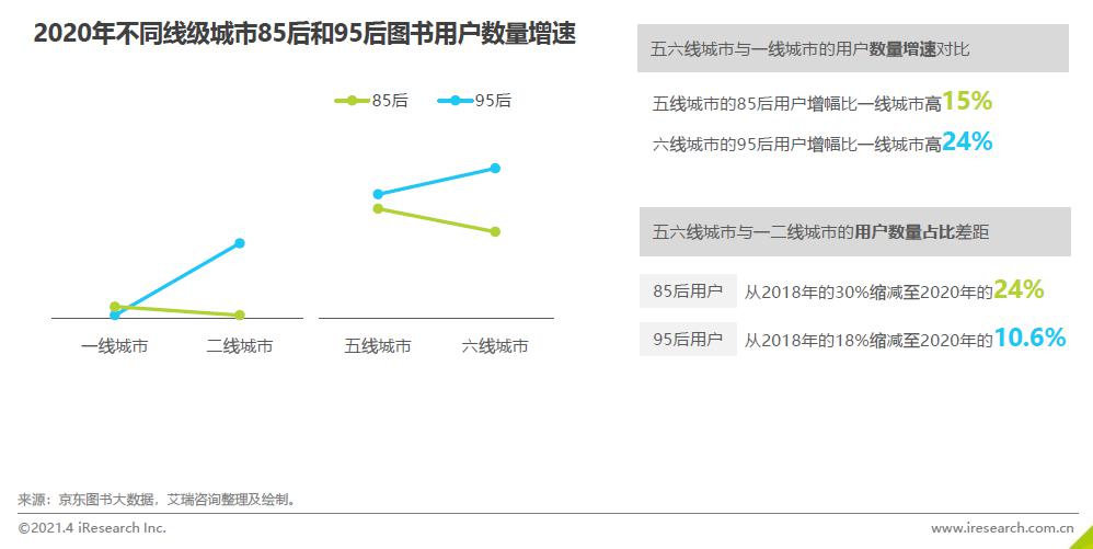 伴随着以京东图书为代表的零售平台对下沉市场的持续加码,下沉市场新兴用户的阅读需求被进一步满足。尤其是25岁以下的用户,在下沉市场的购书增长表现也颇具张力。《报告》显示,95后用户数量在六线城市的增幅比一线城市增幅高24个百分点。高增速下,五、六线城市与一、二线城市的95后用户数量占比差距大幅缩减——从2018年的18%缩减至2020年的10.6%。