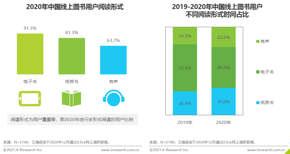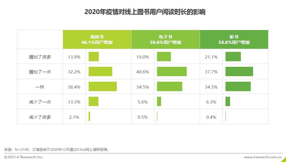 2020年,人们的阅读时长明显增加。这其中,46.1%的用户增加了纸质书阅读时间,59.6%用户增加了电子书阅读时间,58.8%用户增加了听书时间,而同时购买电子书、有声和纸质书的用户数量,较2019年增长了40%。