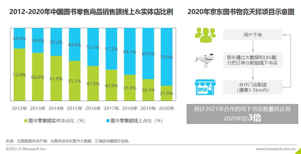 另外值得注意的是,2020年受疫情影响,不少用户的购书渠道加速向线上转移。《报告》显示,2020年中国图书零售商品销售额,线上和实体店的占比分别为79%和21%,线上购书已经成为用户的主要购书方式。