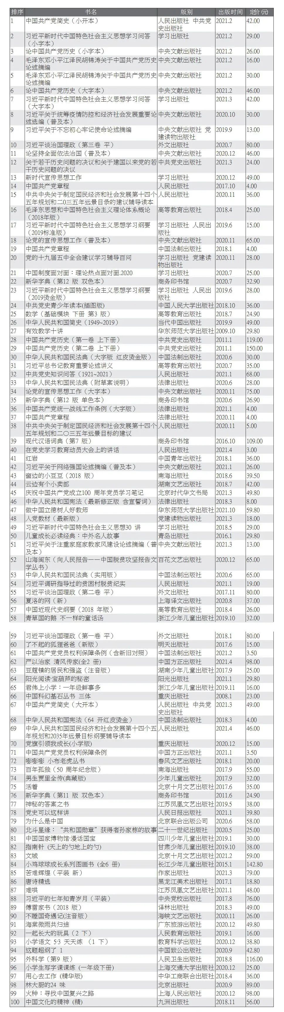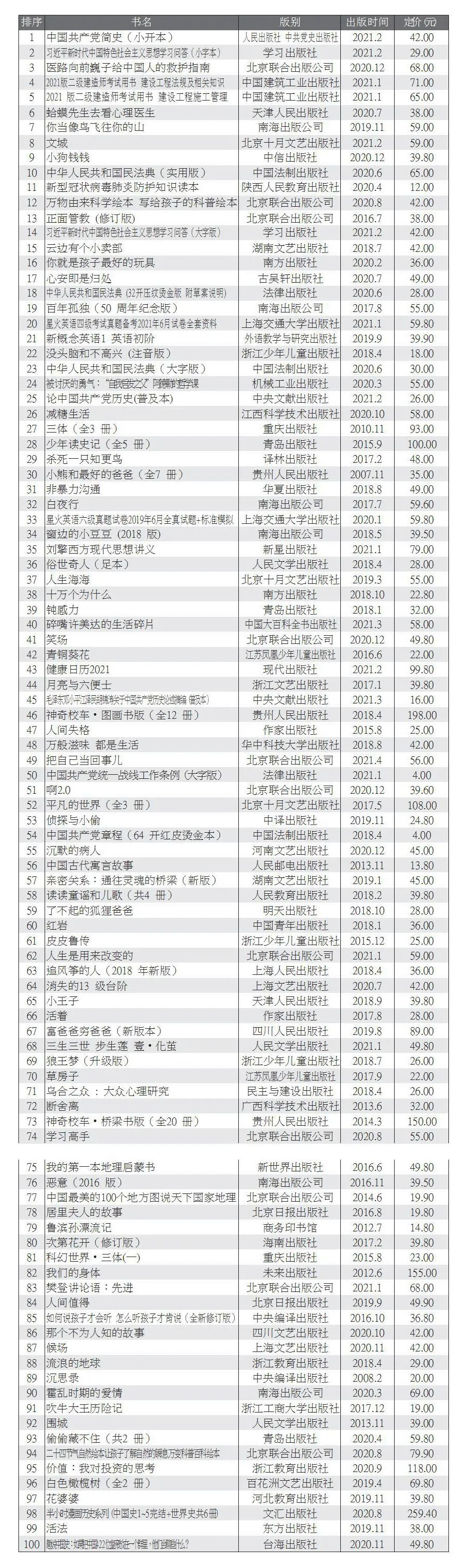 表2 2021年4月图书零售线上市场TOP100(按销量降序排列)