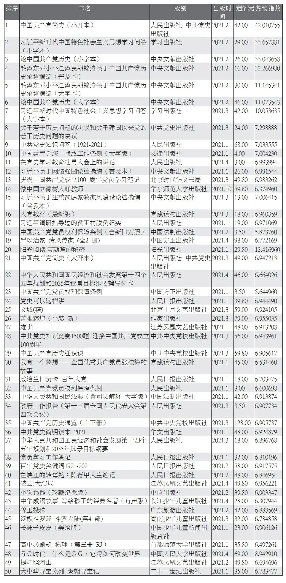 4月份,线下、线上市场动销新书均达上万种,线下市场新书动销品种超过一季度。列居图书零售整体市场、线下市场销量前7位和线上市场销量前2位的全部为当年新书,这种新书霸榜现象前所未有。而从反映新书热销状况的线下动销新书TOP50(见表3)可见,位居前列的这几种主题图书热销指数超高,可谓对这几种图书超大销量、广覆盖、热销活跃度高的诠释。