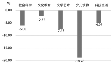 从4月份线上市场的销售趋势看,由于前述致因线上网店销售同比回落,各细分市场销售也均不同程度地回落。其中,少儿读物细分市场销售同比下降18.76%;文化教育书细分市场销售同比下降2.32%;文学艺术书细分市场销售同比下降7.47%;社会科学书细分市场销售同比下降6.00%;科技生活书细分市场销售同比下降4.96%(见图5)。