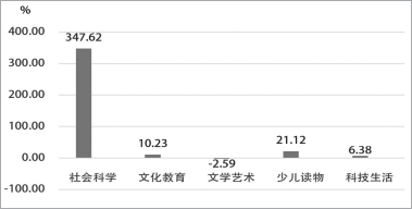 除社会科学图书外,4月份,线下文化教育书细分市场销售同比增长10.23%;少儿读物细分市场销售同比增长21.12%;科技生活书细分市场销售同比增长6.38%;文学艺术书细分市场销售同比下降2.59%。