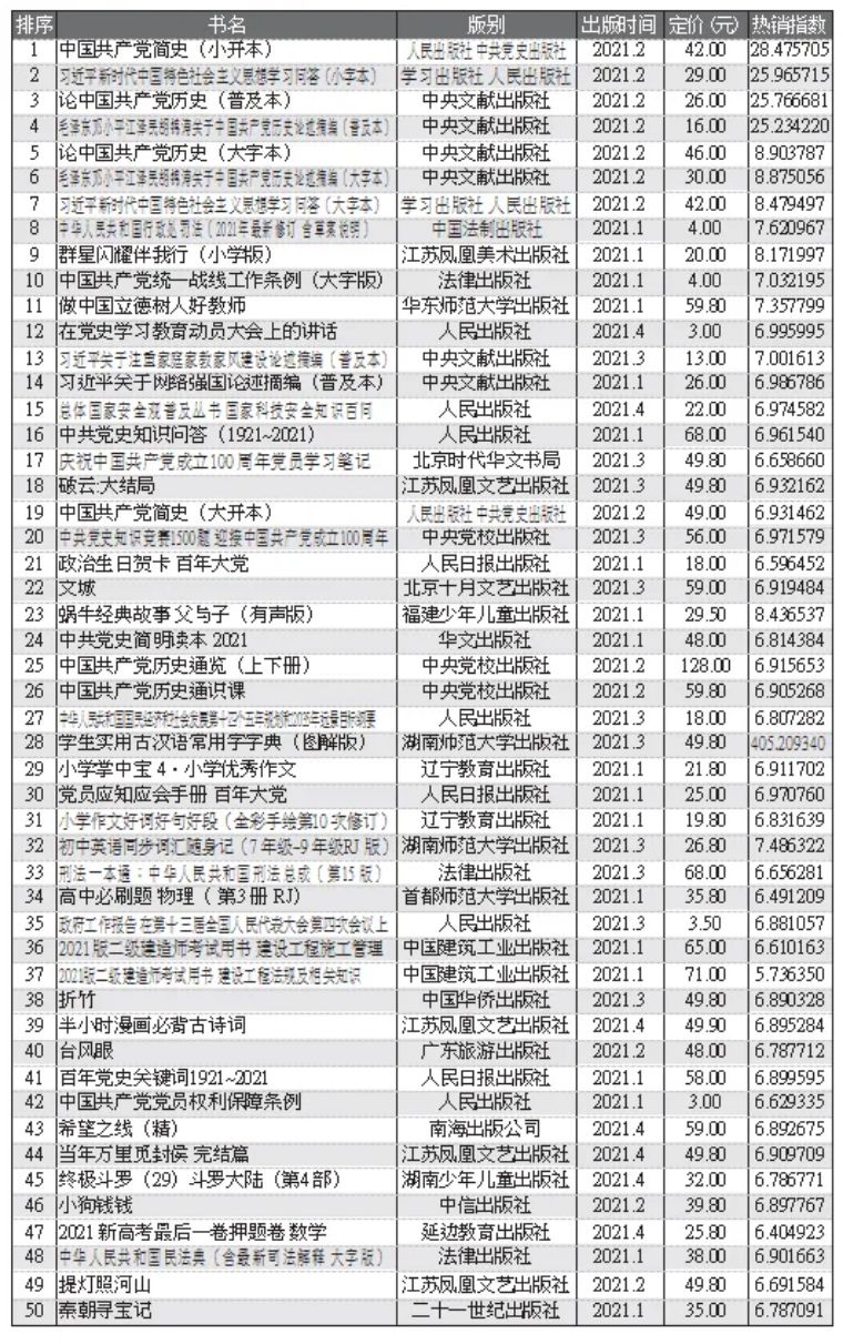 表3 2021年4月线下市场当年新书TOP50
