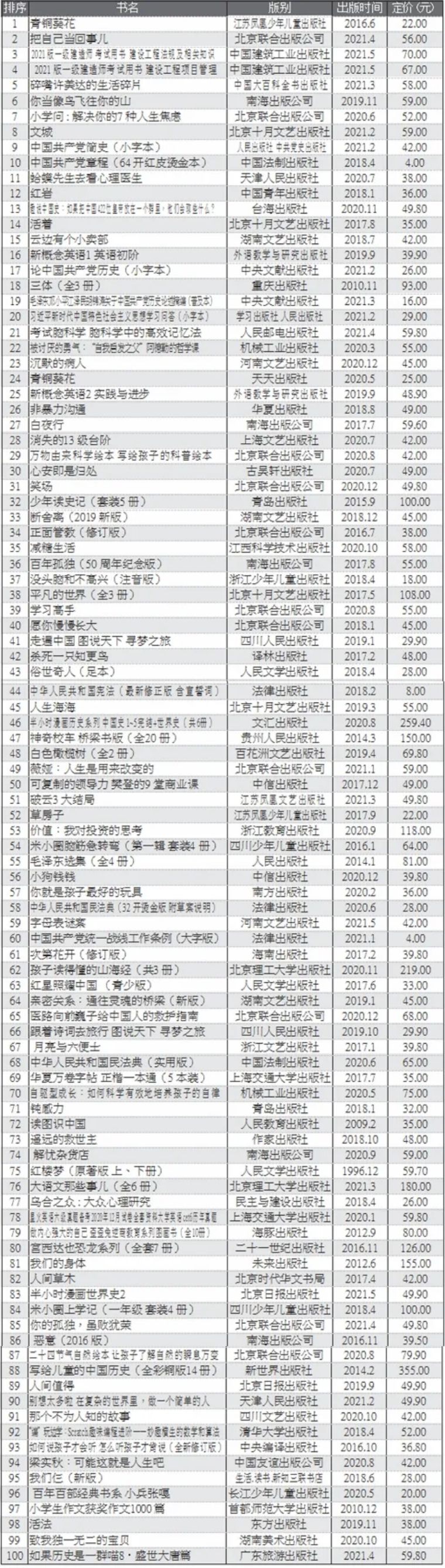 表1 2021年5月图书零售线下市场TOP100(按销量降序排列)