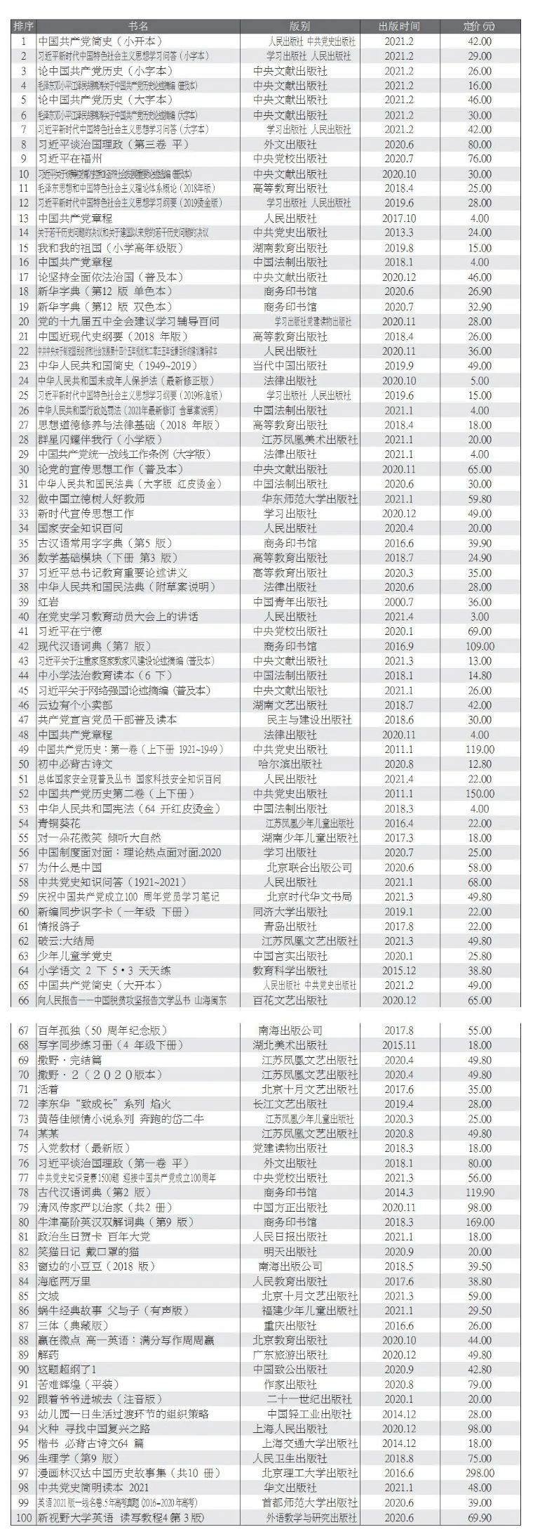 表2 2021年5月图书零售线上市场TOP100(按销量降序排列)