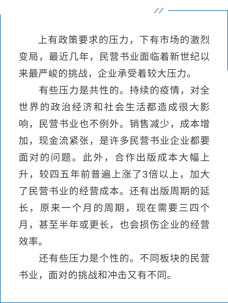 所有的变局都是洗礼,所有的变局也蕴育着机会。民营书业是出版业较有活力、效率和创新的群体,但愿更多民营书业企业能度过危机,危中寻机,以更多优秀的文化产品,助力我国出版繁荣和中华民族的文化复兴。