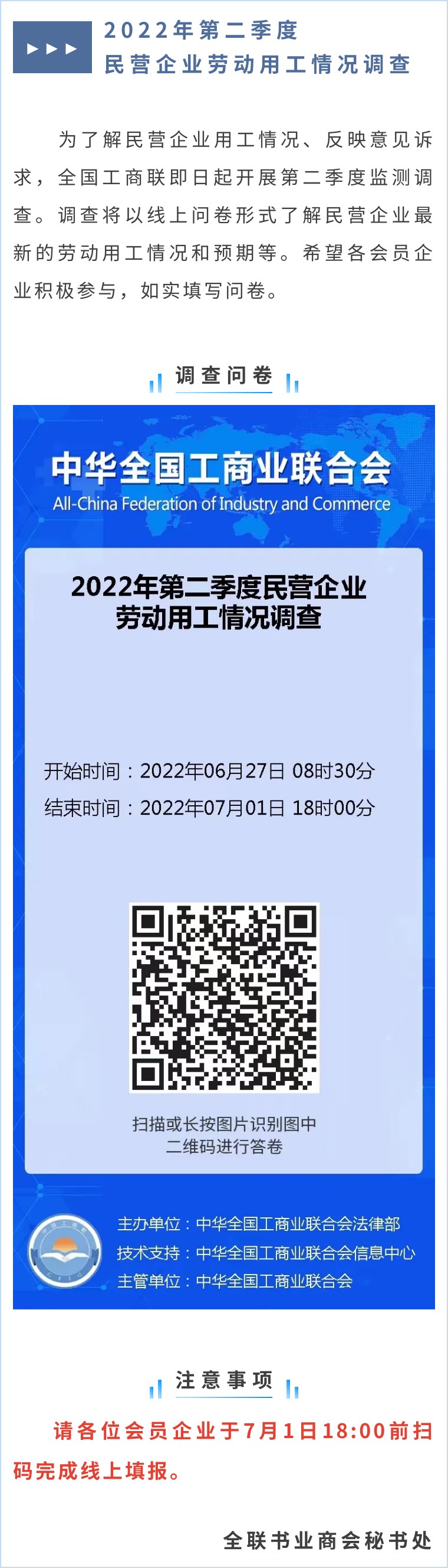 全国工商联第二季度民营企业劳动用工情况调查开始啦!