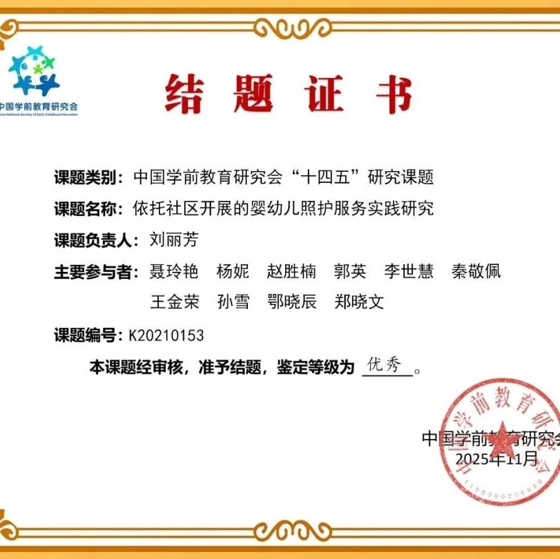 由芃禾·托育核心团队承担的中国学前教育研究会“十四五”研究课题——《依托社区开展的婴幼儿照护服务实践研究》已圆满完成结题工作,并获评鉴定等级:优秀! 该课题自2021年正式立项,历经四年系统研究与实践深耕,形成了一套兼具理论深度与实践广度的社区托育服务体系。这不仅是芃禾托育在科研与实践结合道路上的一座里程碑,更是我们推动行业进步、服务社会家庭的郑重承诺。 一、课题成果速览围绕“依托社区开展婴幼儿照