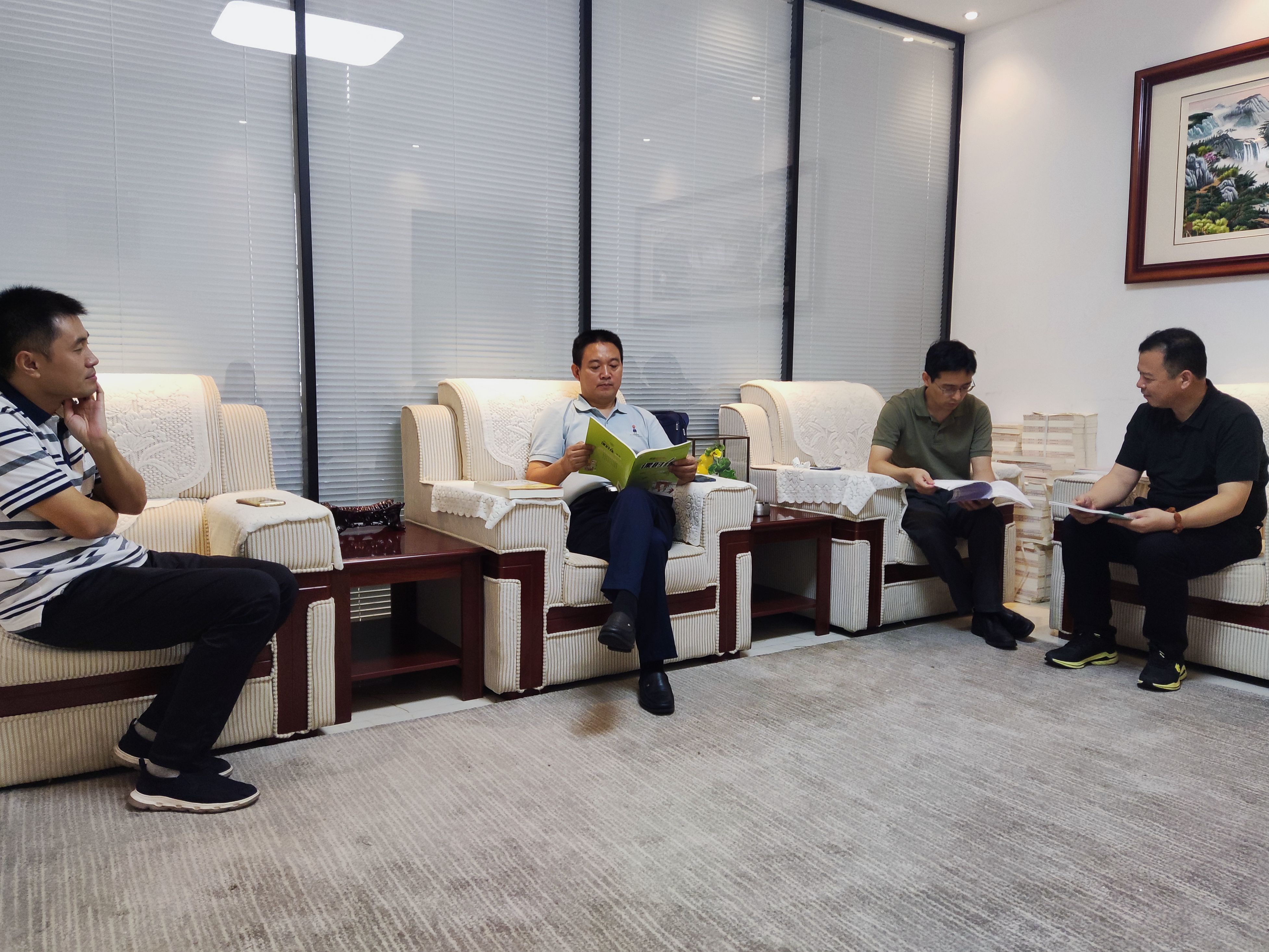 2022年8月25日上午,泰安市政府副市长、市工商联主席冯能斌,泰安市工商联副主席周晓、张新明,泰安市泰山区工商联主席孙超,泰安市泰山区文旅局局长赵刚平,泰安市工商联副主席、泰山新闻出版小镇董事长高建喜,泰安市总商会副会长徐涛一行莅临全联书业商会交流考察。全联书业商会秘书长刘乔森,党支部书记郭继恩,党支部副书记、副秘书长韩鹏,监事会监事陈璞,副秘书长田明莉陪同座谈。