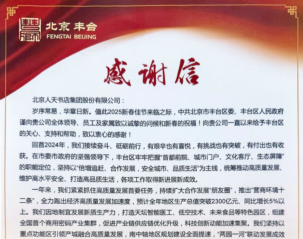 2025年1月22日,人天书店集团收到中共北京市丰台区委、北京市丰台区人民政府的感谢信。信中对人天过去一年在文化创意领域发展方面作出的积极贡献表示诚挚感谢。 中共北京市丰台区委、北京市丰台区人民政府的