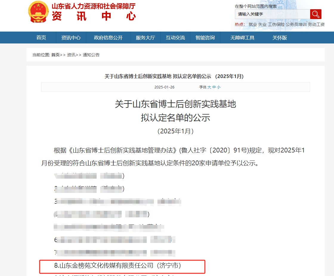 近日,山东省人力资源和社会保障厅公布了2025年1月份受理的符合山东省博士后创新实践基地认定条件的申请单位名单,经过严格的评审和公示,山东金榜苑文化传媒有限责任公司(以下简称“金榜苑”)成功获批山东省