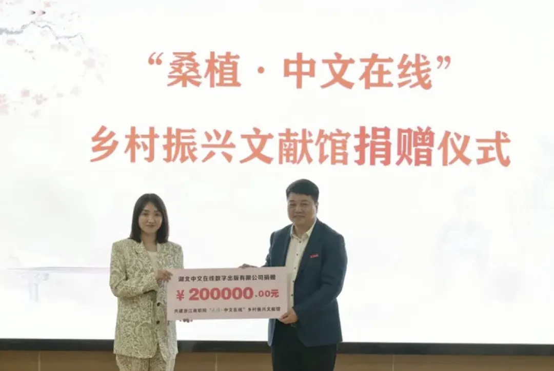 近日,浙江商业职业技术学院图书馆“桑植•中文在线”乡村振兴文献馆捐赠、揭牌仪式顺利举办,湖北中文在线数字出版有限公司常务副总裁陈曲,浙江商业职业技术学院校党委书记何瑶伟、校长李贤政、党委副书记应金萍、