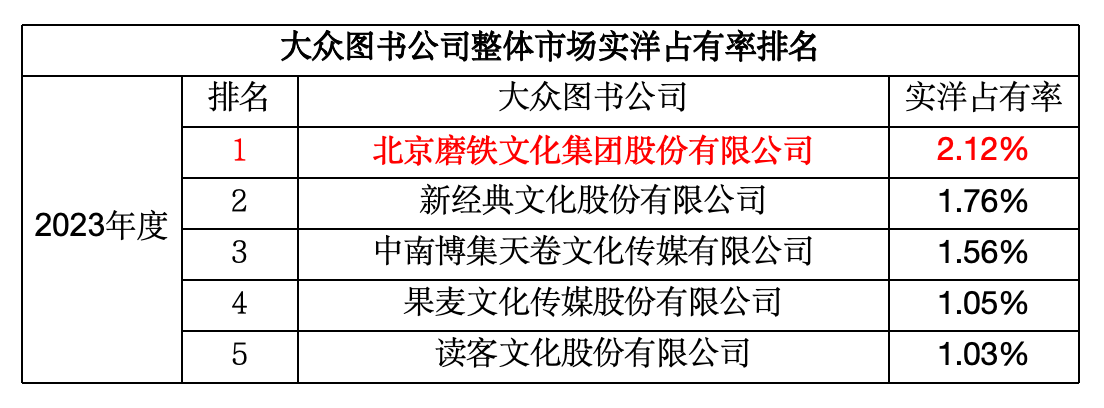 1月6日,在中国出版协会、中国书刊发行业协会指导下,北京开卷发布了“2023年图书零售市场年度报告”。根据开卷公布的数据,北京磨铁文化集团股份有限公司位列2023年出版公司整体市场和新书市场实洋占有率