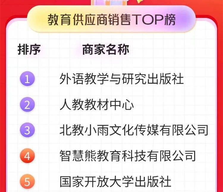 11月12日,2023年的冬季已经到来,图书产品在电商平台的销售却热度不减,在当当平台公布的“双十一”大促活动各项榜单中,北教传媒公司旗下北教小雨公司位列“教育供应商销售TOP榜”前三名;由北教小雨公