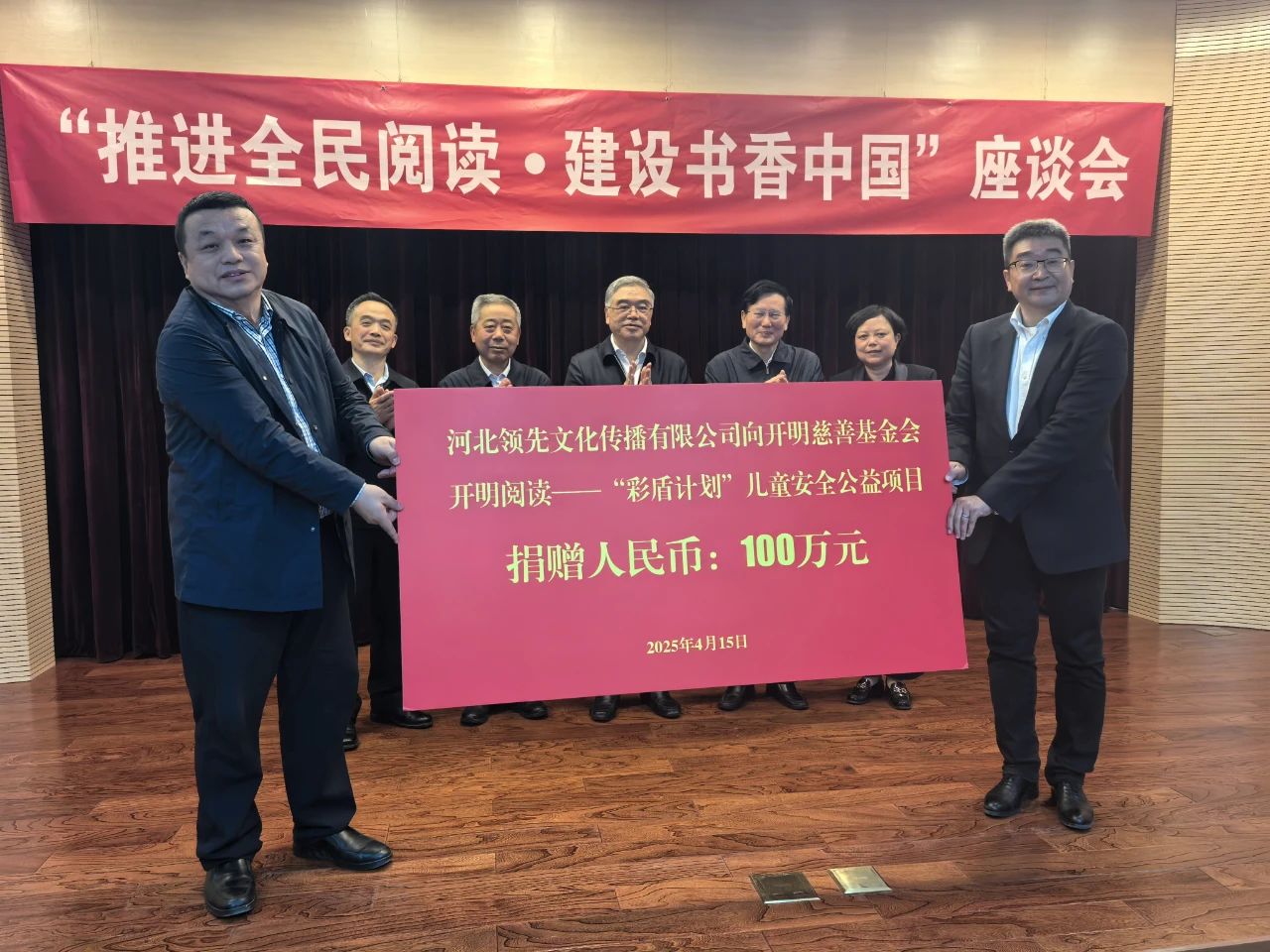 近日,在民进河北省委会的推动下,在开明慈善基金会的协调下,领先文化在民进中央"推进全民阅读 建设书香中国"座谈会现场,向开明慈善基金会开明阅读——"彩盾计划"儿童安全公益项目捐赠现金100万元。 项目