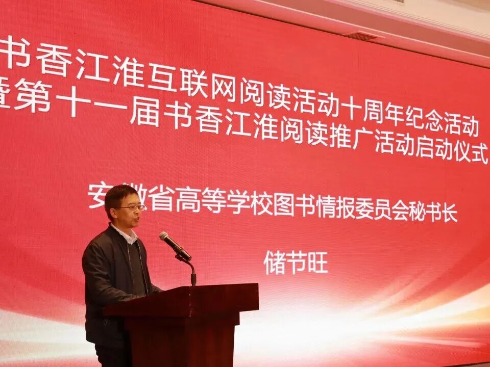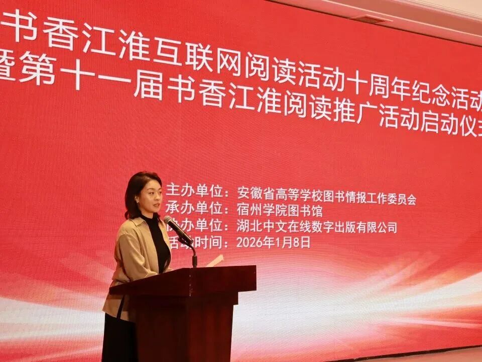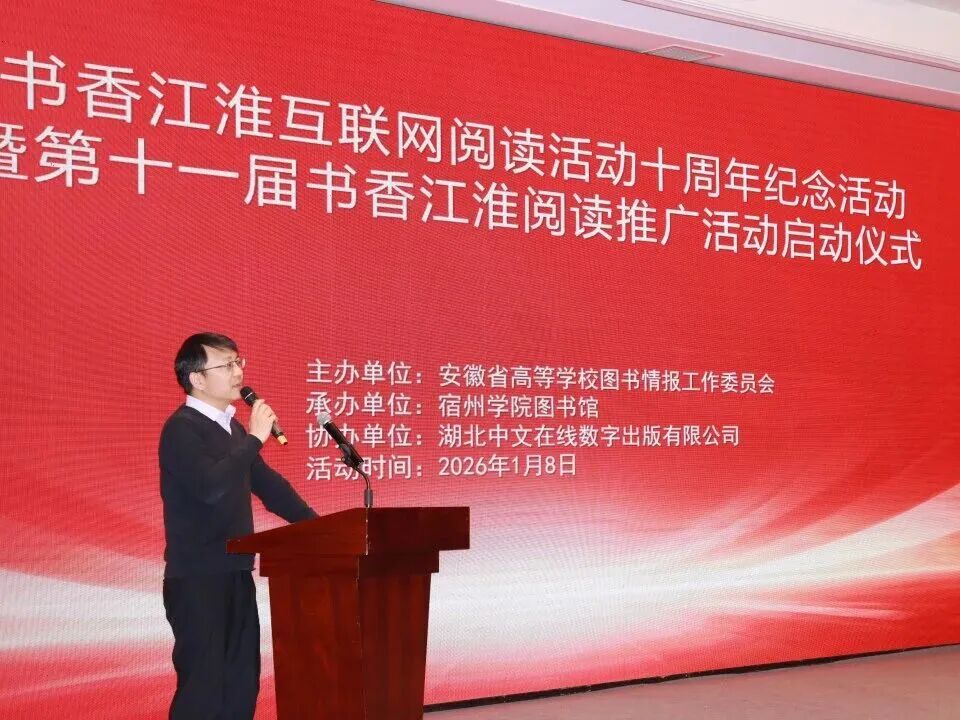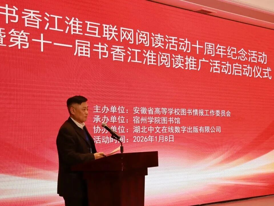 2026年1月8日,由安徽省高等学校图书情报工作委员会主办,宿州学院图书馆承办、湖北中文在线协办的“书香江淮”互联网阅读活动十周年纪念活动暨第十一届活动启动仪式在宿州隆重举行。本次活动以“十年书香路,智启新未来”为主题,回顾十年辉煌历程,表彰先进典型,共话发展蓝图。安徽省委宣传部、省教育厅、省图书馆学会、省出版协会等相关单位领导、全省高校图书馆代表、合作企业嘉宾及师生代表齐聚一堂,共同见证这一重要时刻。