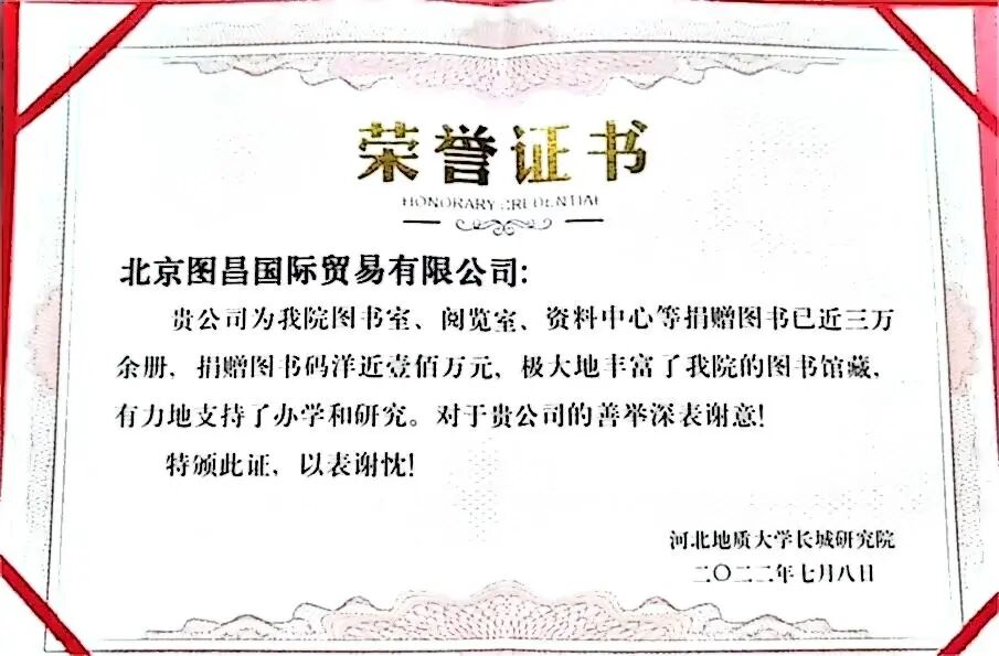 2022年为丰富河北地质大学长城研究院图书馆馆藏资料,支持其办学和研究,捐赠30000余册图书,约100万码洋,并获荣誉证书。