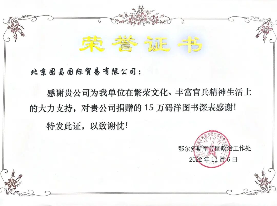 2022年为繁荣文化、丰富官兵精神生活,向鄂尔多斯军分区捐赠15万码洋图书,获鄂尔多斯军分区荣誉证书。