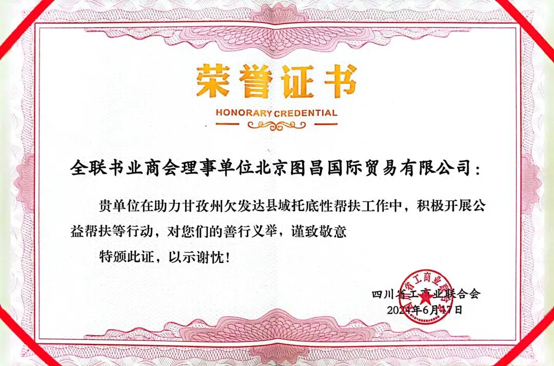 2024年在助力甘孜州欠发达县域托底性帮扶工作中,积极开展公益帮扶等行动,获四川省工商业联合会的认可,并颁发荣誉证书。