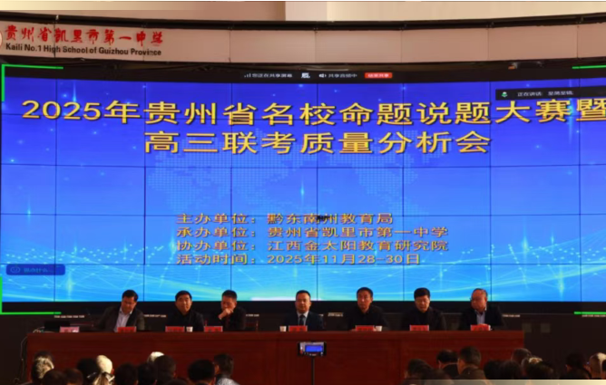 为深入贯彻落实立德树人根本任务,赋能教师专业成长,推动区域教育协同发展与质量整体提升,2025年11月29日至30日,由黔东南州教育局主办、凯里市第一中学承办、江西金太阳教育研究有限公司协办的“贵州省名校命题说题大赛暨高三联考质量分析会”在凯里一中成功举行。全省各市州学校领导老师、名校参赛老师、大赛评委专家及新疆、广西等兄弟省份学校领导老师共1300余名嘉宾,近130所单位齐聚一堂,共绘高中教育高质量发展新蓝图,共商共研高中教育发展大计。